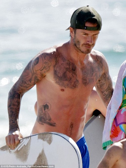 David Beckham – Najlepšie na koniec. Ženy z neho odpadávajú, muži mu závidia. Nie Viktóriu, ale charizmu, šarm a krásne telo, ktorým disponuje tento „futbalista na dôchodku“. Jeho rozsiahla zbierka tetovaní (34 tetovaní) obsahuje aj mená detí a manželky.