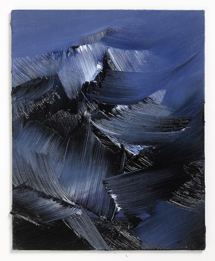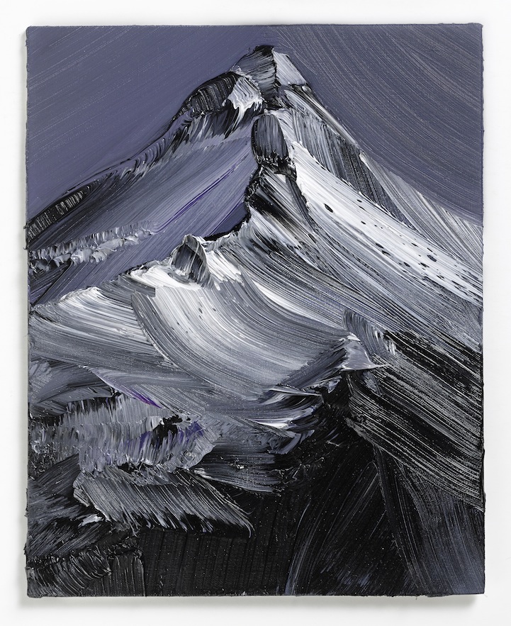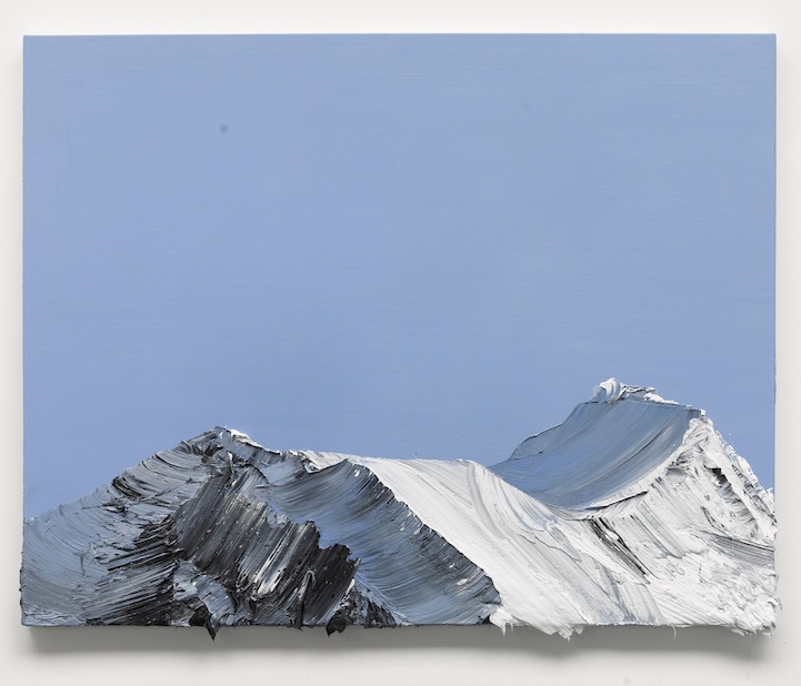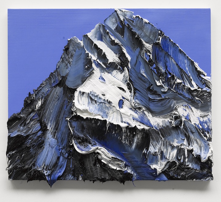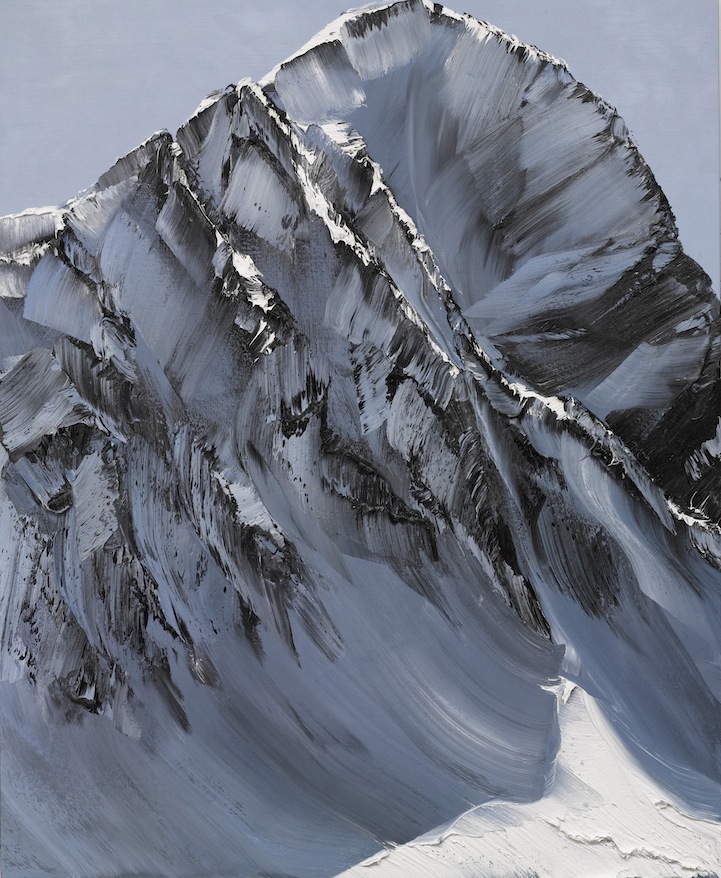Takmer náhodný mix množstva modrej, bielej a čiernej farby stekajúcej z plátna vytvára ilúziu skutočných majestátnych hôr. Vizuálny trik umelec používa k vytvoreniu dokonalých obrazov, ktoré vás po jedinom žmurknutí oka zavedú priamo k mocným štítom švajčiarskych álp.