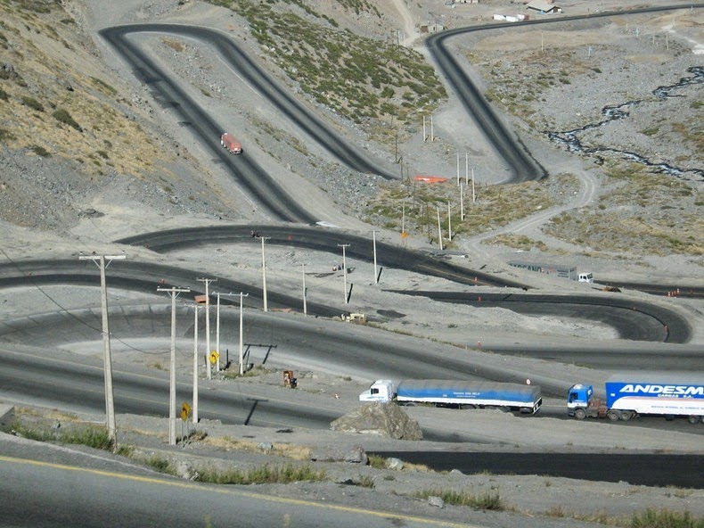 Cesta na Čilskej strane začína strmým stúpaním, približne 50km od mesta Los Andes, ktoré leží 70km severne od Santiaga. Prvých 20 serpentín sa ťahá asi 4 kilometre so zmenou v nadmorskej výške z 2,275 m na 2,550 m. Cesta potom stúpa o niečo miernejšie ďalšie 2 kilometre na nadmorskú výšku 2,650 m. 9 zostávajúcich serpentín vás dostane 2,800 m nad more a od tohto bodu je to ešte 7 kilometrov ku začiatku starej cesty vedúcej až na samotný vrchol.