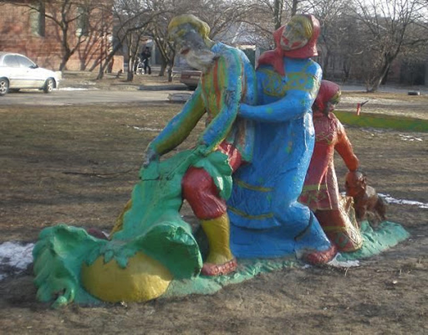 Streetartistami poupravená socha, ktorá straší na detskom ihrisku.