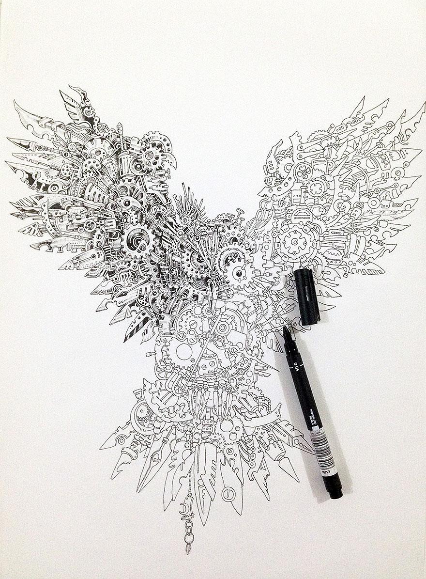 Jeho najnovšie dielo sa volá Strážca času. Tento úžasný portrét sovy nám ponúka nečakaný zvrat – sova je totiž zložená z malých ozubených kolies, čapov a iných mechanických kúskov, ktoré sú nakreslené naozaj do posledného detailu.