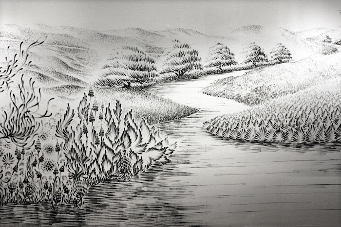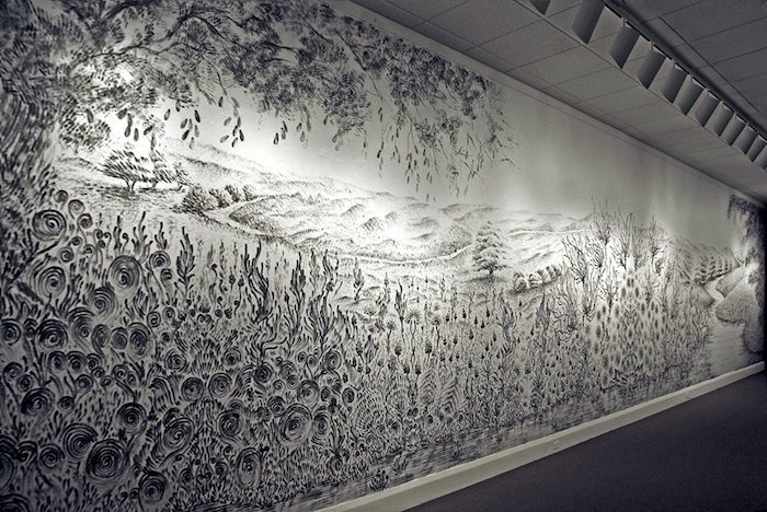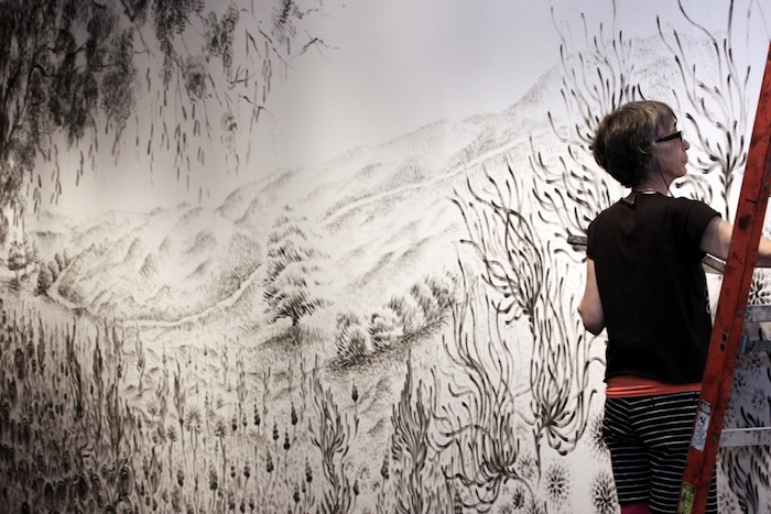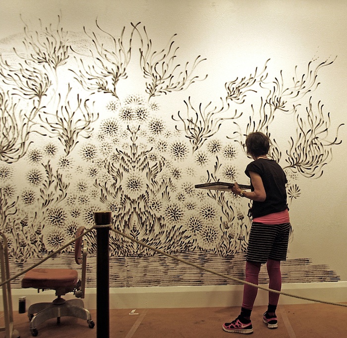 Na tom by nebolo nič zaujímavé, avšak jej pracovným nástrojom sú prsty namáčané v rozdrvenom uhlí alebo grafite. Podkladom je čistá biela stena, a tak vznikajú nezvyčajné maľby kontrastnej čierno-bielej farby.