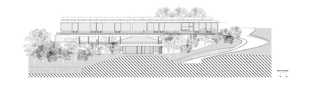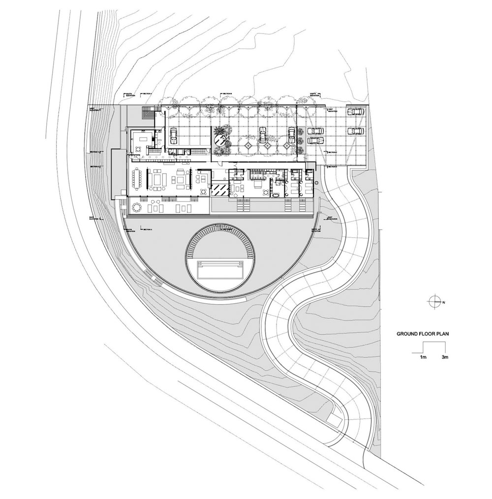 Obývacia izba, jedáleň, kuchyňa a spálňové krídlo boli umiestnené na jednom poschodí spolu so vstupnou terasou a garážou v hornej časti areálu. Suterén pod hlavným poschodím zahŕňa herňu a vnútorný bazén. Na rovnakej úrovni, ale v prednej časti prízemia, bol umiestnený vonkajší bazén a barbecue salónik, ktoré spolu so zaoblenou terasou tvoria ústredný bod celého dvora.  Kruhová terasa je čiastočne zastrešená polkruhový trávnikom, vďaka čomu si môžu návštevníci vychutnať neuveriteľný výhľad z príjemného chládku.