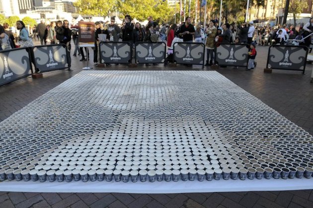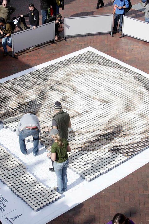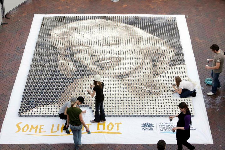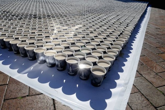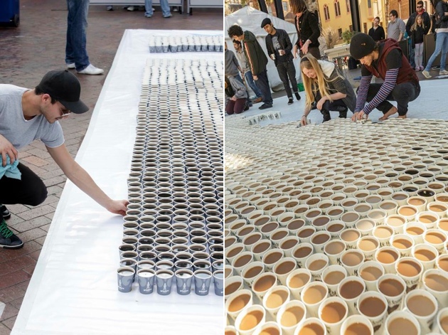 Kávoví nadšenci totiž vytvárajú obrazy známych osobností len za pomoci plastových pohárov naplnených kávou a mliekom. Aby dosiahli sépiové odtiene, do kávy vmiešavajú požadované množstvo mlieka. Výsledkom sú mozaiky Mony Lisy či Marilyn Monroe. Na výrobu koláži bolo potrebných cez 4000 pohárov.
