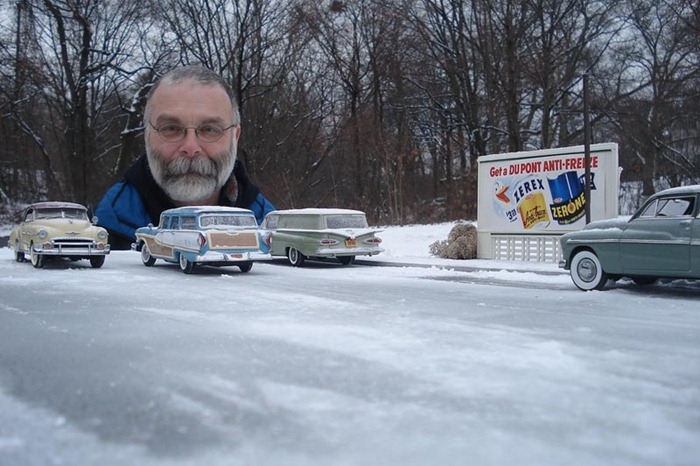 Vytvoril makety domčekov, autá dosadil zo svojej zbierky a nezabudol ani na ten najmenší detail. Vo svojich dielach dokáže nasimulovať rôzne počasie ako popršanú cestu alebo sneh, dokonca strieda ročné obdobia a mestečko fotí aj v tme. Treba podotknúť, že fotografie vznikajú bez použitia Photoshopu.