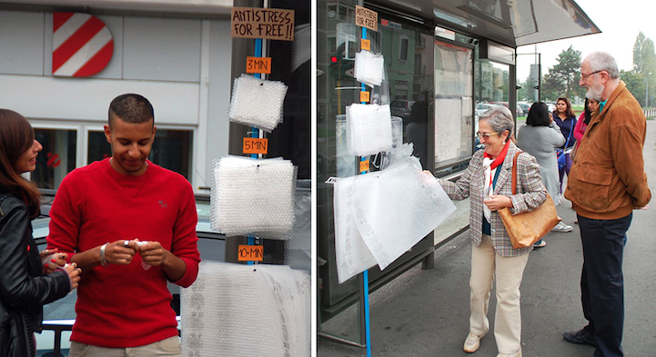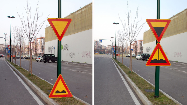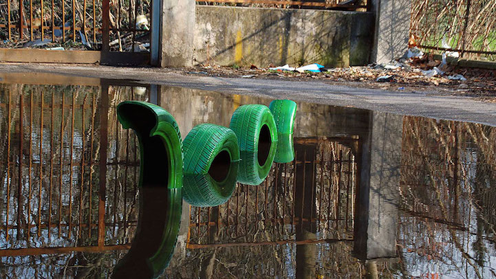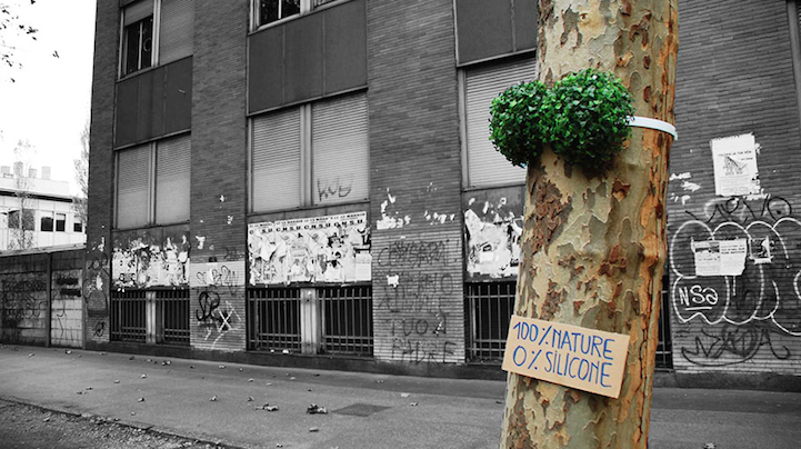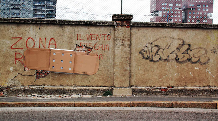 V Miláne, kde momentálne pôsobí, tak máte šancu vidieť Lochnessku vytvorenú v mláke zo starých pneumatík, obriu náplasť prelepenú cez zničený múr, či „toi-toiku“ pripomínajúcu obriu krabičku od džúsu.