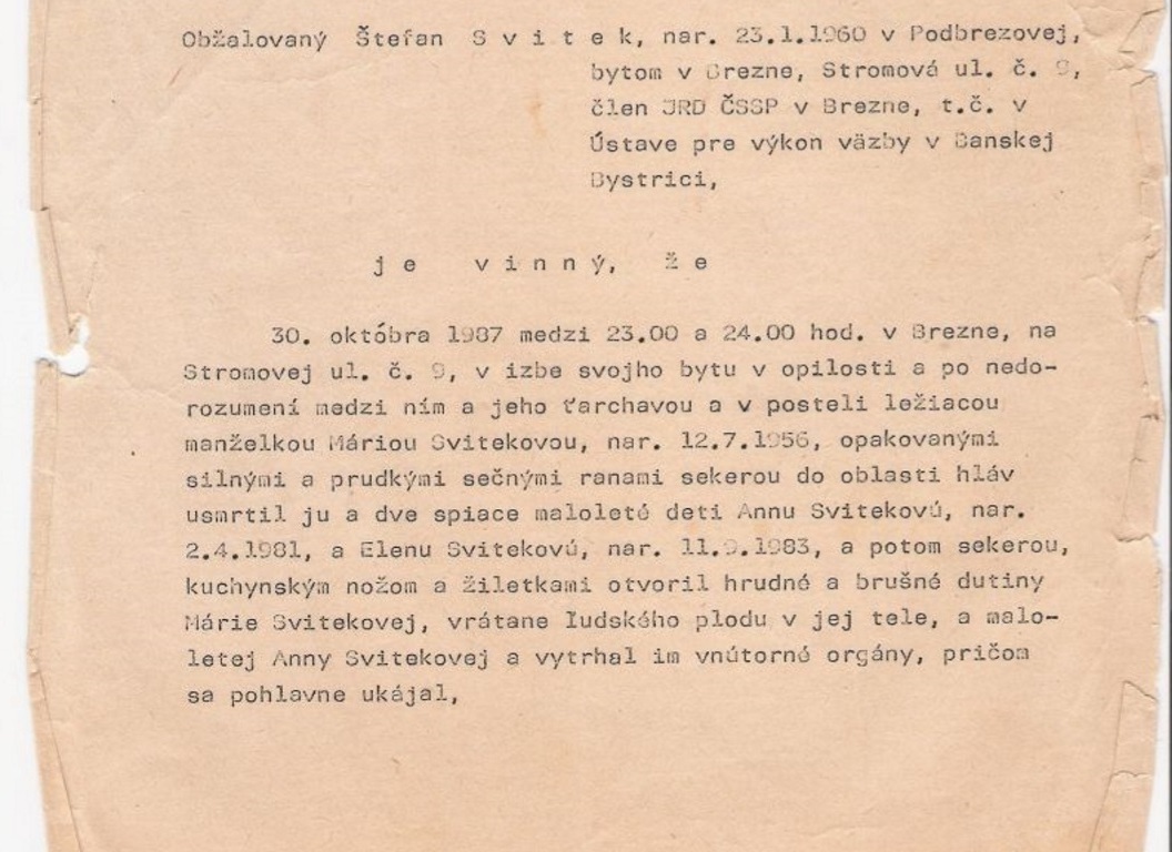 Osudným dňom pre rodinu Štefana Sviteka bol 30. október 1987. Cez deň Svitek spoločne s kolegom narezali a odviezli drevo známemu. Ten im dal za odmenu víno a chlapi sa šli doraziť do miestnej krčmy. Keď mal Svitek svoju „hladinku“, rozhodol sa ísť domov. Dvere do domu boli zamknuté, a tak začal kričať a búchať. Manželka ho nechcela pustiť dnu a snažila sa ho zahnať so slovami, aby sa vrátil tam, odkiaľ prišiel. To ho tak rozzúrilo natoľko, že za pomoci sekery vylomil dvere. Strhla sa hádka a Štefan ju ukončil 16 ranami sekerou do svojej ženy. Potom, ako sa začali prebúdzať aj jeho dcéry (4 a 6 rokov), zaútočil aj na nich. Krv ho silne vzrušila a prebudila v ňom monštrum. Kuchynským nožom rozrezal trup svojej žene, vybral jej vnútornosti a odrezal prsia. Bez povšimnutia nenechal ani šesťmesačný plod dieťaťa, ktorý chladnokrvne rozrezal za pomoci žiletky. Nad telami sa sexuálne ukájal. Začalo svitať a Štefan z miesta činu ušiel. Chcel sa opiť a následne spáchať samovraždu. To sa mu nepodarilo, pretože zaspal. Na druhý deň chcel svoj plán dokončiť, to sa mu však opäť nepodarilo. V cudzom dome sa chcel obesiť, avšak trám to nevydržal a Svitek spadol z veľkej výšky na zem a upadol do bezvedomia. Medzitým našli Štefanovu zmasakrovanú rodinu a polícia začala pátrať po vrahovi. Netrvalo dlho a Sviteka chytili. Ten sa k činu priznal.