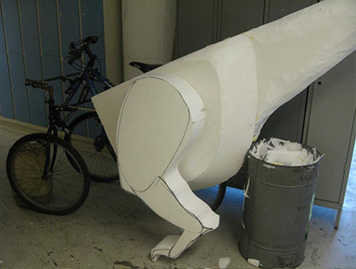 Umelec zvaril dokopy tri rôzne rámy bicyklov na výrobu konečného vozidla, ktoré by podporilo jeho myšlienku. Pomocou obyčajného kuchynského noža vyrezal z polystyrénu tvar dinosaura, hlavu a chvost zvlášť. Materiál pokryl epoxidovým lepidlom a vrstvou sklených vlákien, a potom maľoval vrstvy červenej a oranžovej farby, aby napodobnil drsnú, šupinatú kožu velociraptora. Potom už len pridal hlavu a chvost, v strede bicykla nechal priestor pre seba a dielo bolo hotové. Z diaľky to vyzerá prinajmenšom dosť zvláštne, vtipne a nečakane, keď vidíte umelca, ako jazdí cez mesto na chrbte dinosaura.
