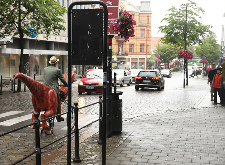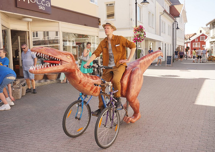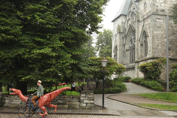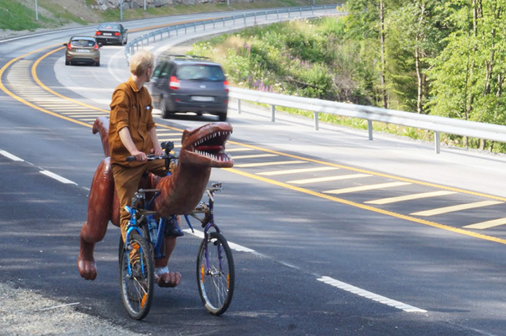 Nórsky umelec vyvinul úplne bizardný spôsob dopravy cestujúc cez tzv. bible belt Nórska (región s vysokým percentom protestantov) ako formu protestu. Vysvetľuje, že „je to protest proti dogmatickému náboženskému vzdelávaniu detí a myšlienka vznikla z tematických parkov, ktoré učia deti, že ľudia a dinosaury žili spoločne."
