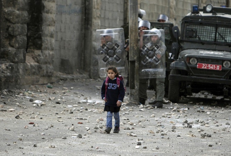 Túto fotografiu odfotil Ammar Awad v roku 2010. Nebojácne dievčatko kráča po ceste posiatej kameňmi, ktoré hádzali palestínski demonštranti na skupinu Izraelčanov.