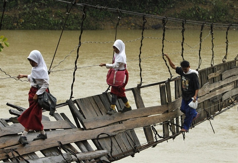 Odvážne deti z ďalšej indonézskej dediny prechádzajú cez rieku po starom akvadukte, aj napriek tomu, že nie je určený pre ľudí. V inom prípade by museli absolvovať vyše šesťkilometrovú cestu do školy.