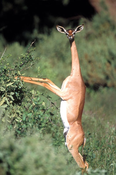 Gerenuk. Toto zvláštne stvorenie vyzerá ako niečo medzi antilopou a žirafou. Pochádza z východnej Afriky. Jej dlhý krk a dlhé končatiny sú prispôsobené tak, aby mohol dosahovať potravu zo stromov a vysokých krovín.