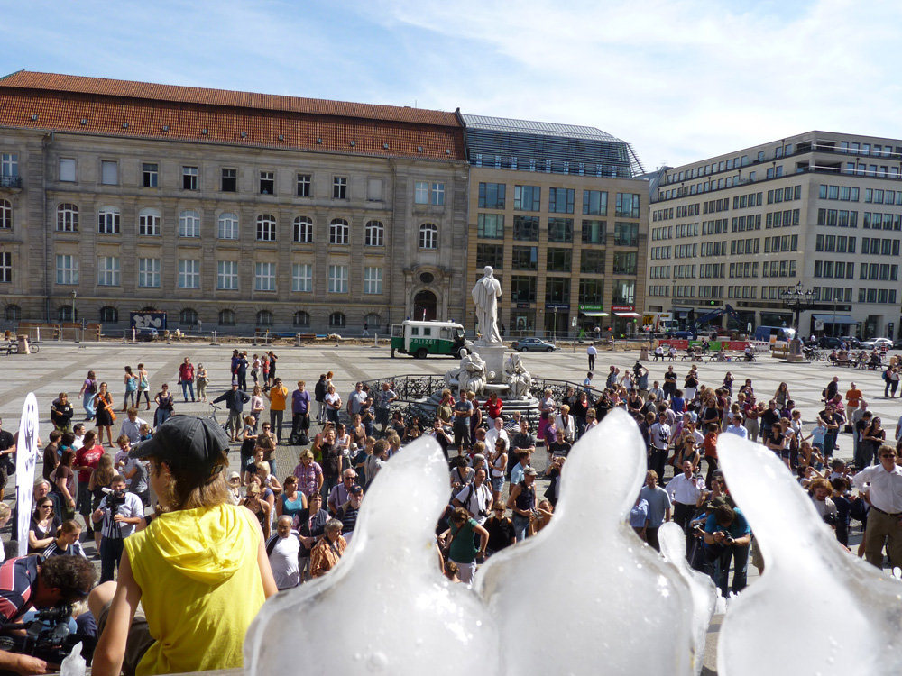 Brazílsky sochár Nele Azevedo na schody Chamberlain Square v Birmingham usporiadal 5 000 malých ľadových sošiek, aby si pripomenul obyčajných ľudí a vojakov, ktorí prišli o život počas druhej svetovej vojny. Topiace sa figúrky vytvorili naozaj príznačný a hrôzostrašný obraz o obetí, ktoré rovnako ako topiace sa figúrky postupne padali v nemilosrdnej vojne. Na vrchole boli korunované červenou soškou, ktorá topením vytvárala červený potôčik znázorňujúci krv obetí.