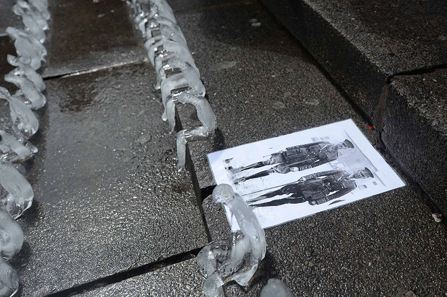 Ľadové sošky sa postupne topia a odchádzajú z tohto sveta rovnako ako ľudia, ktorí prišli o život v krutej vojne.