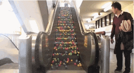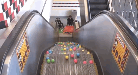 Najprv si treba nájsť voľný a použiteľný eskalátor. Potom zobrať vrece loptičiek a vysypať ho naň. A uvidíte čo sa stane. Loptičky sa vám totiž nikde neodkotúľajú, ani nestratia. Celý čas ostanú na eskalátore a budú sa poňom pohybovať hore-dole. Pohľad na ne je skutočne fascinujúci a hypnotizujúci.