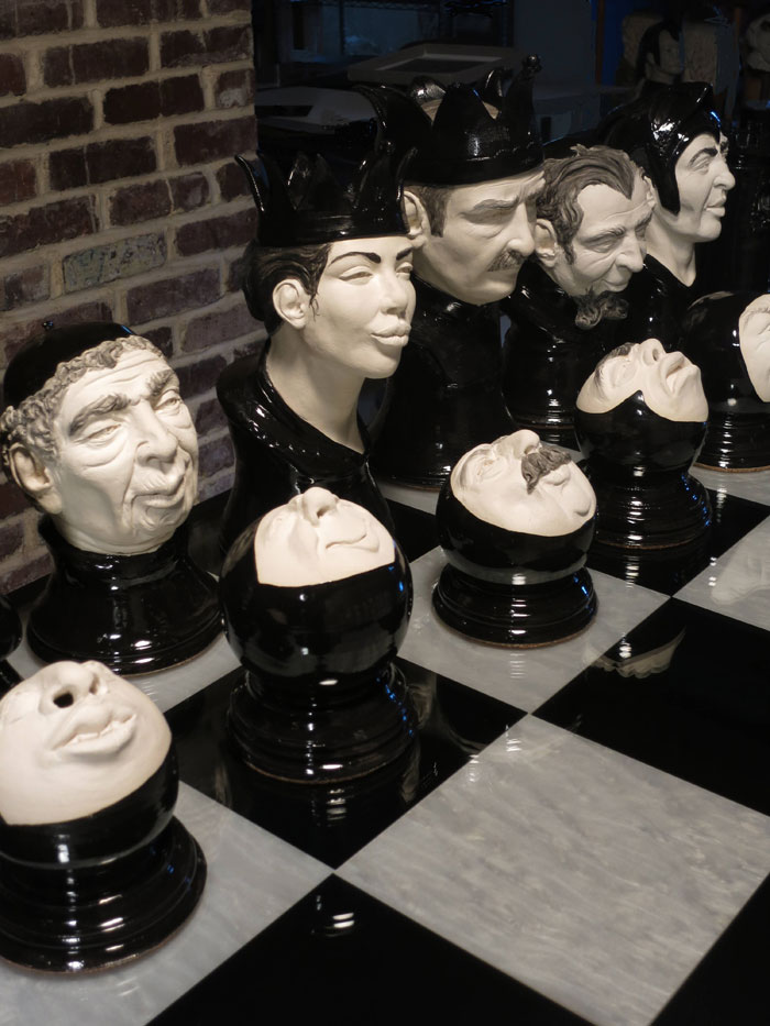 Umelkyňa vytvorila nezvyčajný šachový svet. Každá figúrka má inú tvár a nesie vraj osobitný príbeh. Napríklad čiernu kráľovnú umelkyňa vytvorila podľa tváre čašníčky, ktorá ich počas jednej noci obsluhovala. Musí to byť česť stať sa kráľovskou tvárou v šachu.