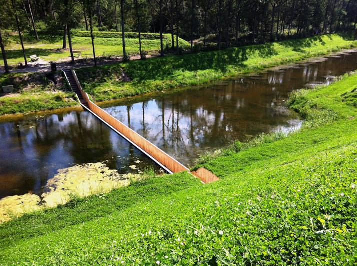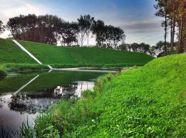 Fort de Roovere je historická pevnosť na juhozápade Holandska a je súčasťou obranných pevností a vodných ciest pochádzajúcich zo 17. storočia, ktoré však postupne chátrali. Architekti skupiny RO & AD boli požiadaní o navrhnutie takého mosta, ktorý by sa perfektne hodil do tejto historickej oblasti a žiadnym spôsobom nenarúšal jej ducha a okolitú prírodu. Preto sa rozhodli pre „neviditeľný most“, ktorý je zasadený priamo v priekope a umožňuje ľuďom takmer nepozorovanie prejsť cez hladinu rieky. Dve priehrady na každom konci priekopy zaisťujú, že ani počas dažďov voda neprekročí steny mostu a nepretečie.